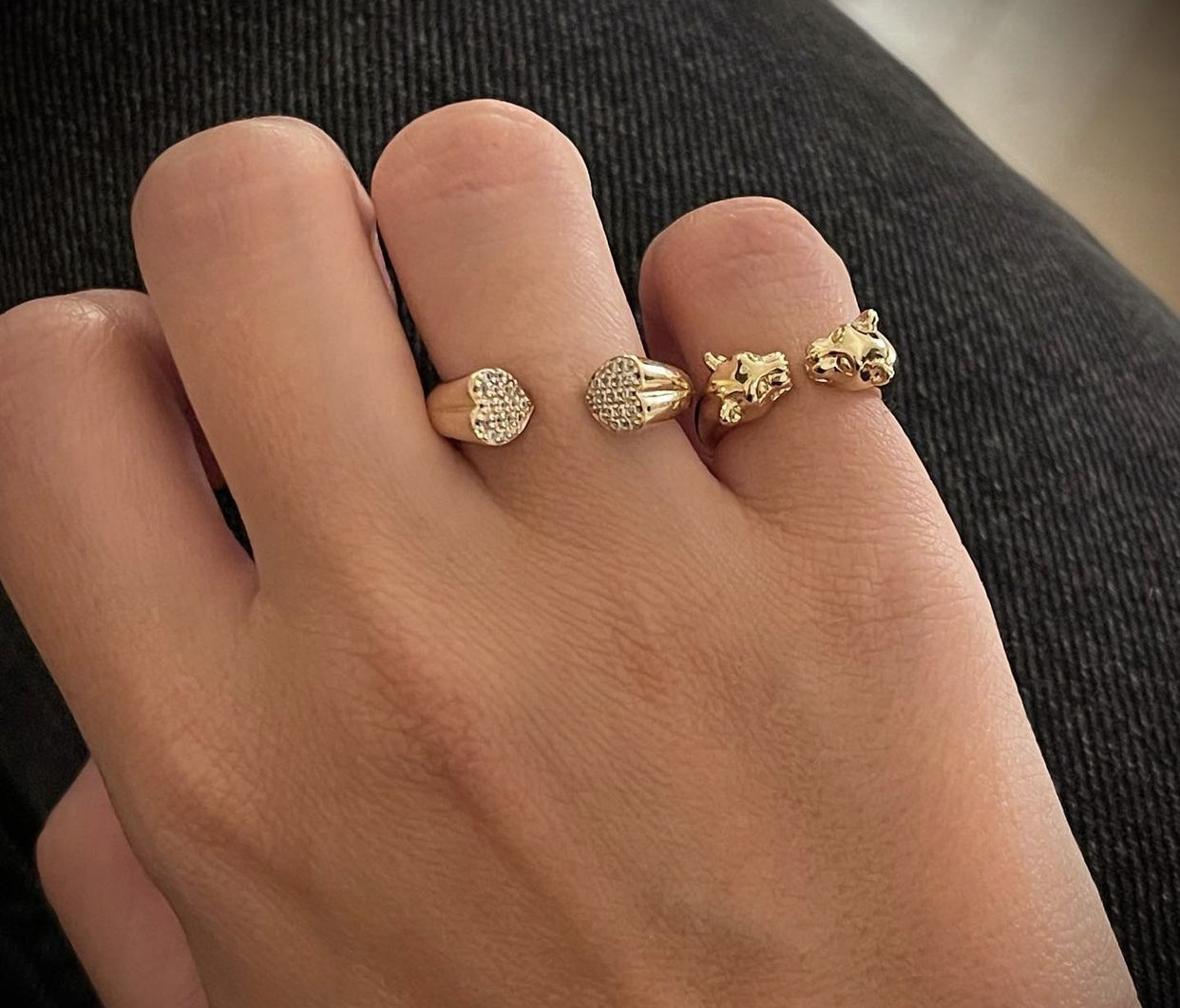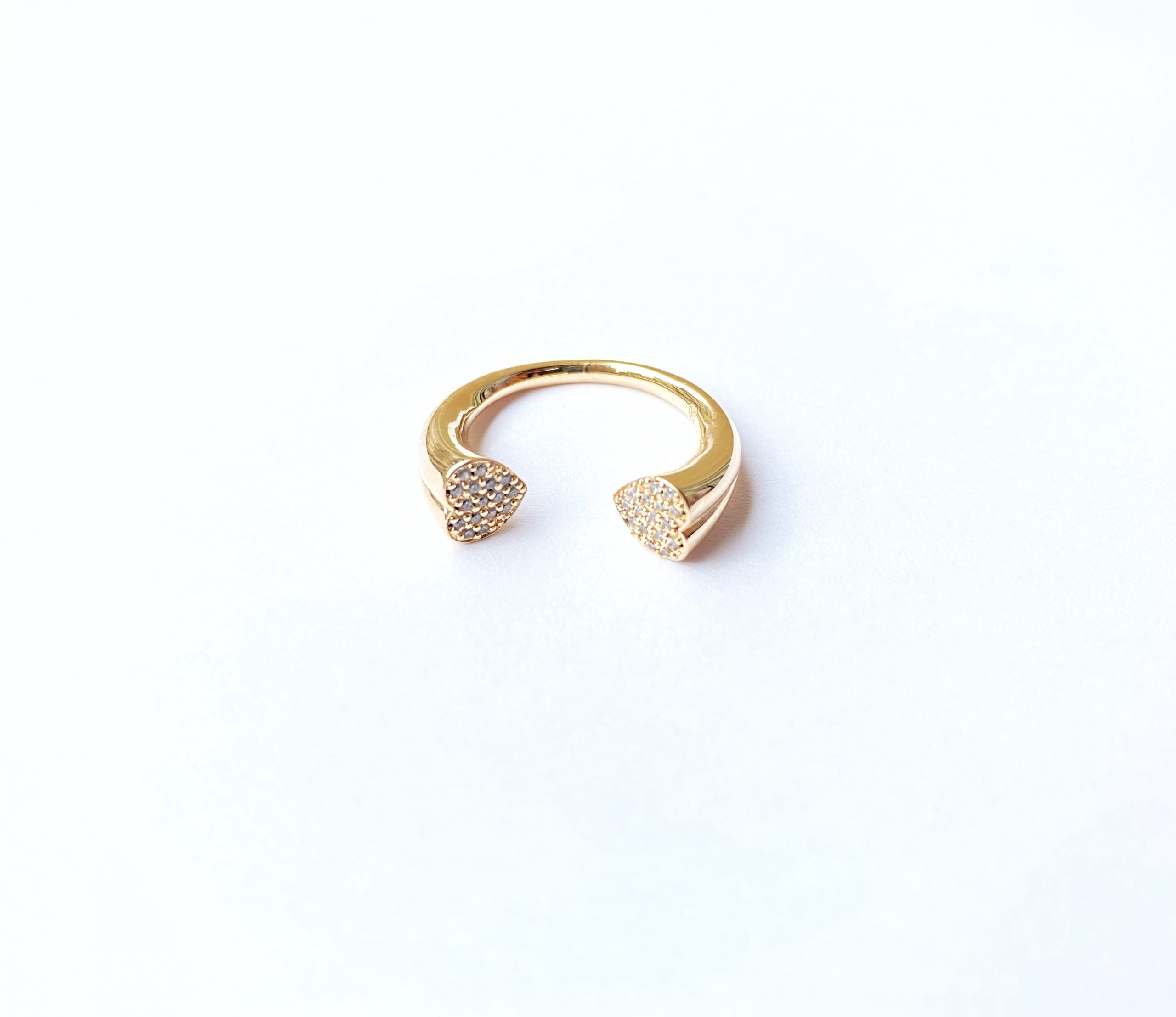 Bague réglable en plaque or avec deux cœurs zirconiums